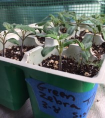 Planted indoors under lights: I use a compact 2-shelf system with T-4 lights from Gardener’s Supply (Vermont). http://www.greenstategardener.com/compact-2-tier-garden-starter-grow-light-kit/ Amos Coli–Baker Creek Green Zebra–Siskiyous Seeds. Germination on day 6. Compari–Belford (home grown). Germination on day 6. Tommy Toe (cherry)– Baker Creek